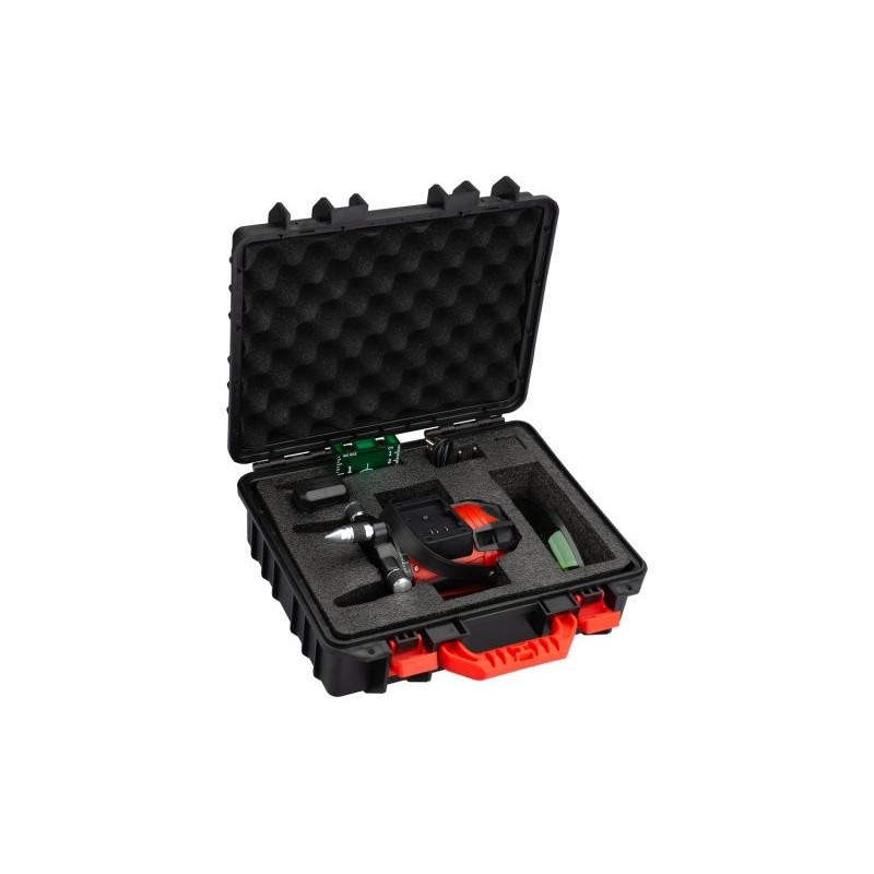 obsah balení : přepravní kufr, Li-ion baterie 2600 mAh, nabíječka, otočný ministativ v rozsahu 360°, cílová destička mm / inch, brýle