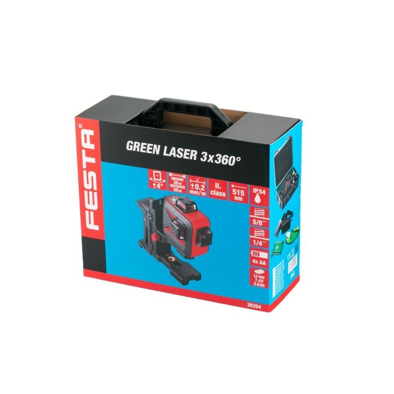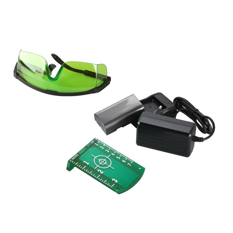 obsah balení : přepravní kufr, Li-ion baterie 2600 mAh, nabíječka, profesionální multifunkční držák, bateriová redukce na AA baterie, 4 x AA alkalické baterie, cílová destička mm / inch, brýle